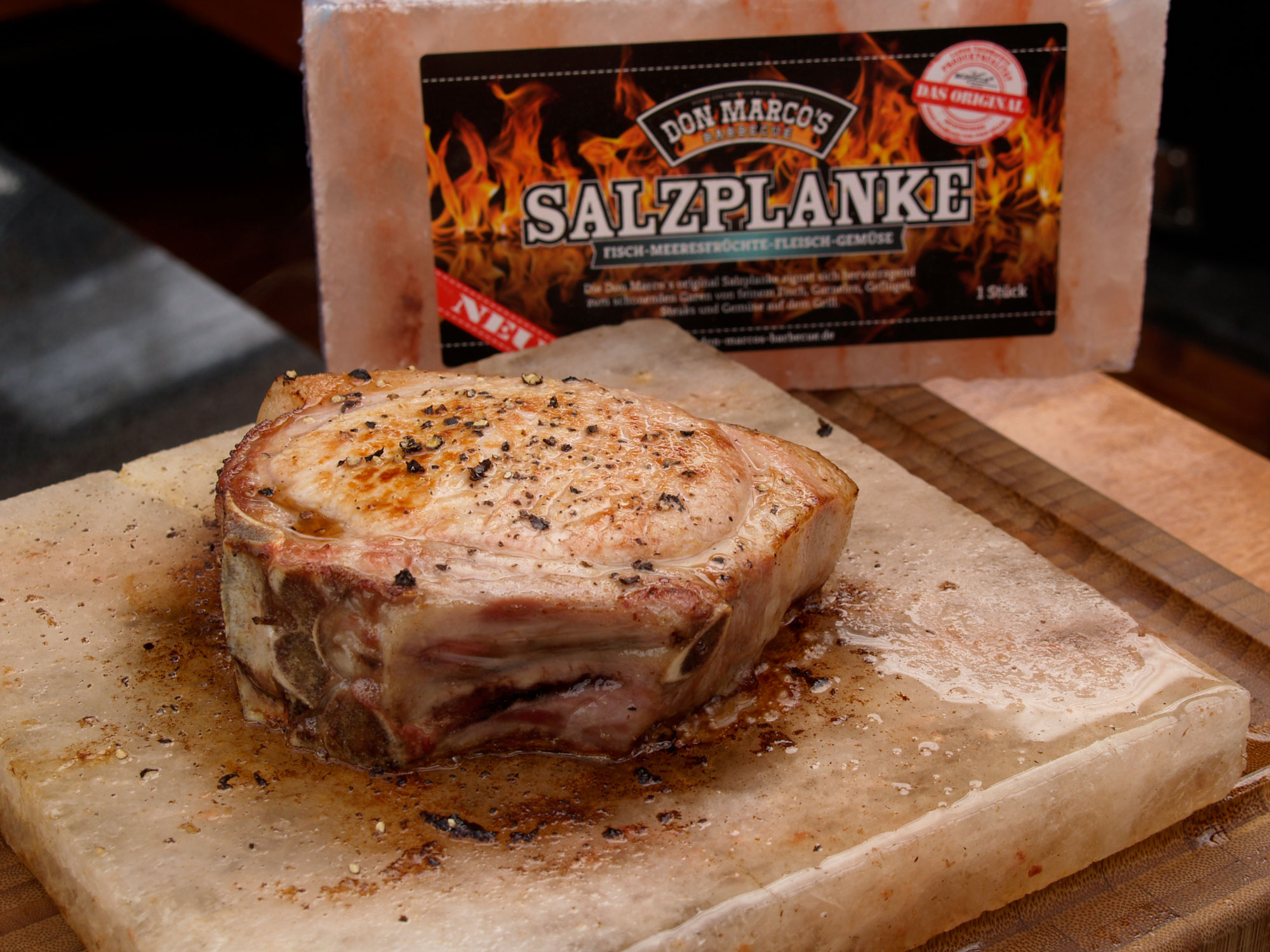 Auf dem heißen Salz bildet sich in kurzer Zeit eine leicht salzige Kruste mit perfekten Röstaromen, während das Steaks schonend gegrillt wird. So einfach ist es nur mit der Don Marco’s Salzplanke L.
